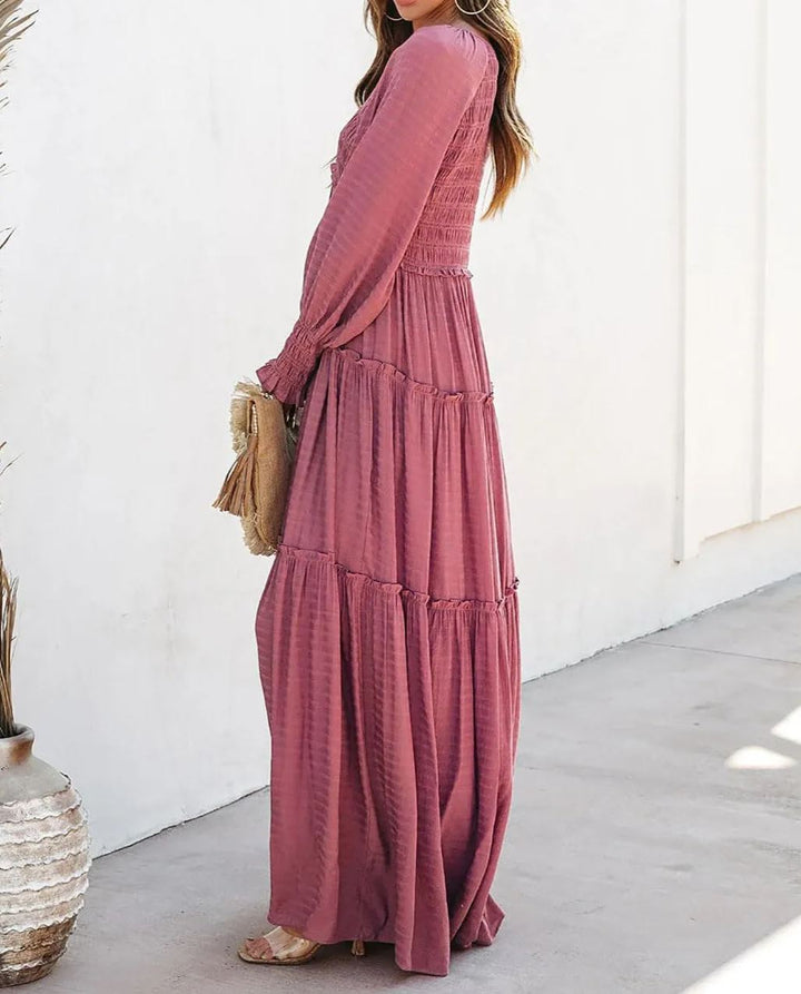 This flowy dress is floor length and looks nice and understated! It has stretchy details on the upper body with a loose layered ruffle hem that not only show your collarbone and shoulder, but also hide the fat in your abdomen, while not swallowing you in fabric.